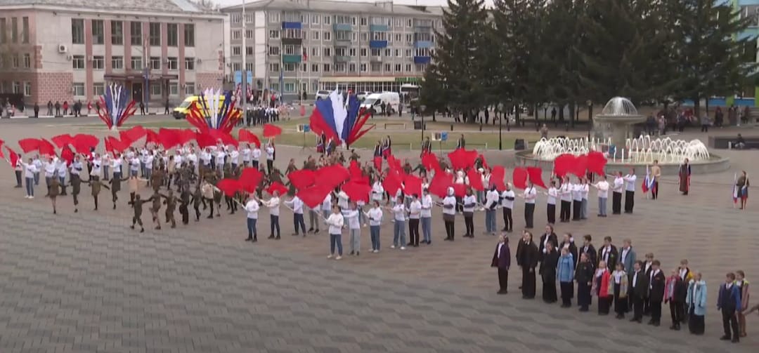 Композиция, представленная зрителям, собрала в себе более 400 человек: солисты, хоры, творческие коллективы учреждений культуры города, юнармейцы Школы №11 им. Героя России А. А. Луценко, волонтёры АКСТ, спортсмены, медики, нефтяники, сотрудники РЖД и МЭЗ «Амурский».