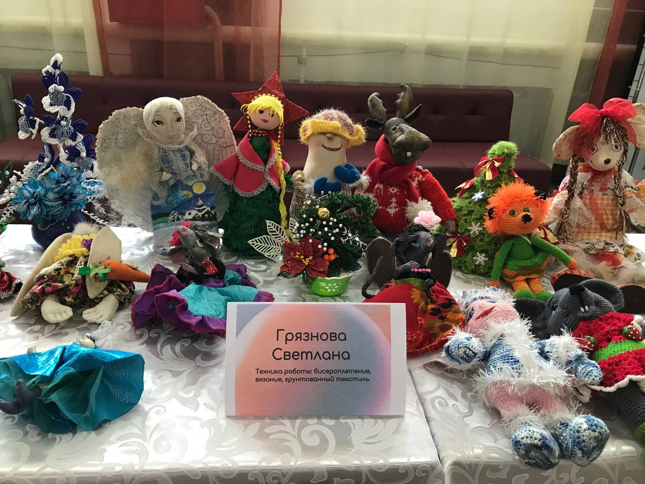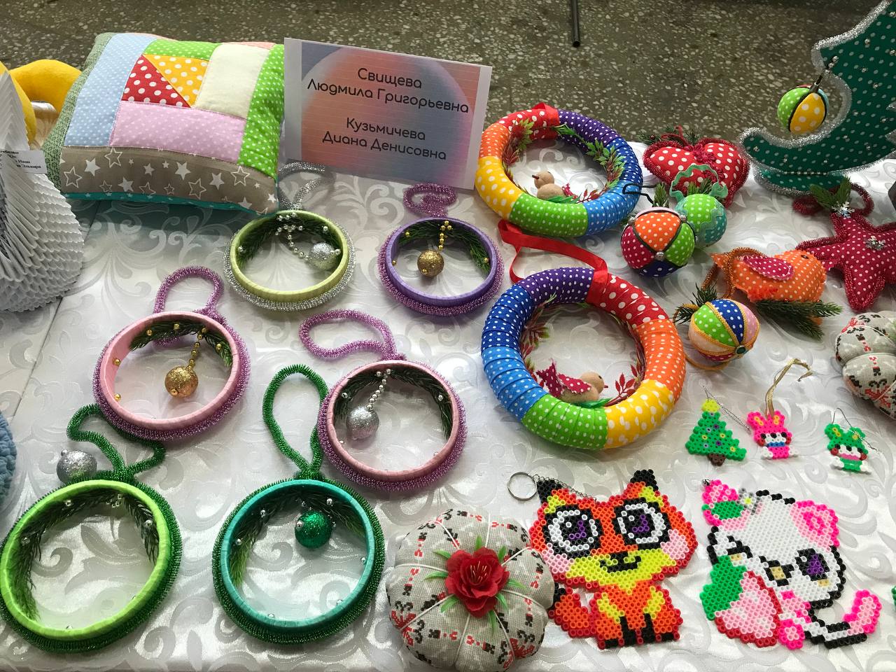 Свои работы представили : Ольга Свищева - ёлочные игрушки из атласной тесьмы и лоскутов; Диана Кузьмичева - игрушки из конструктора; Светлана - бисероплетение, вязание , грунтованный текстиль; Людмила Николаева- бисероплетение; Наталья Дударева – валяние, вязание; Цирикова Оксана , Подшивалов Александр, Ирина Брычёва – скручивание салфеток.
