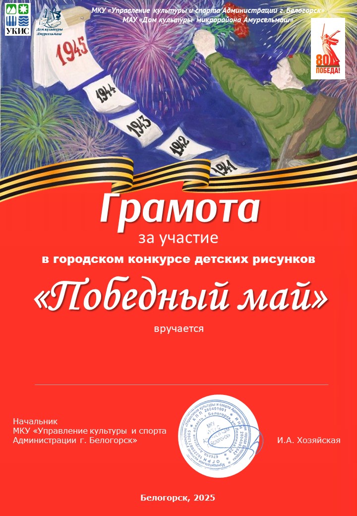 📅 7 мая в уютных стенах Дома культуры мкр. «Амурсельмаш» прошло награждение победителей городского конкурса детского рисунка «Победный май». Этот творческий конкурс стартовал 27 апреля, и в нем приняло участие 50 юных художников в возрасте от 4 до 16 лет!