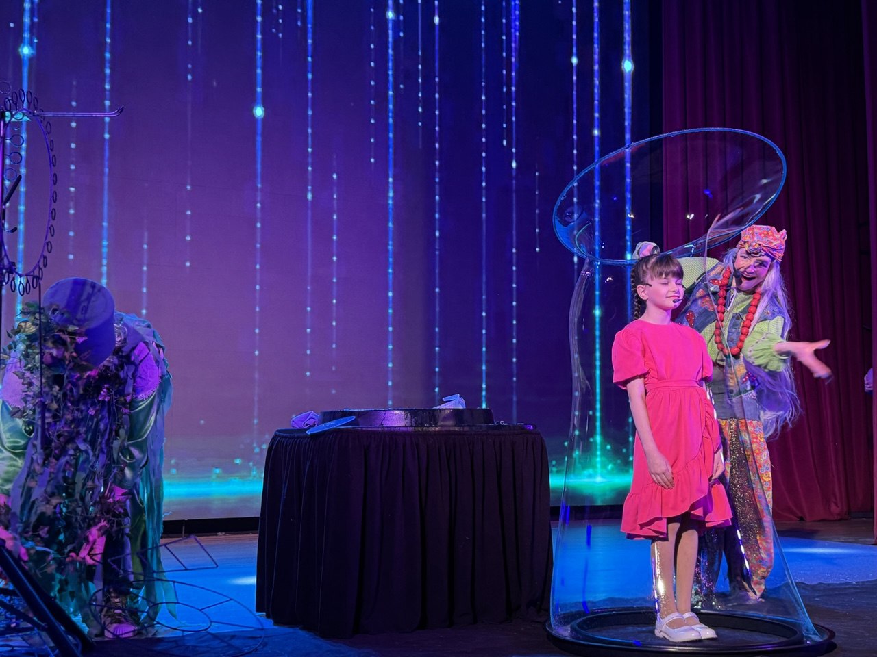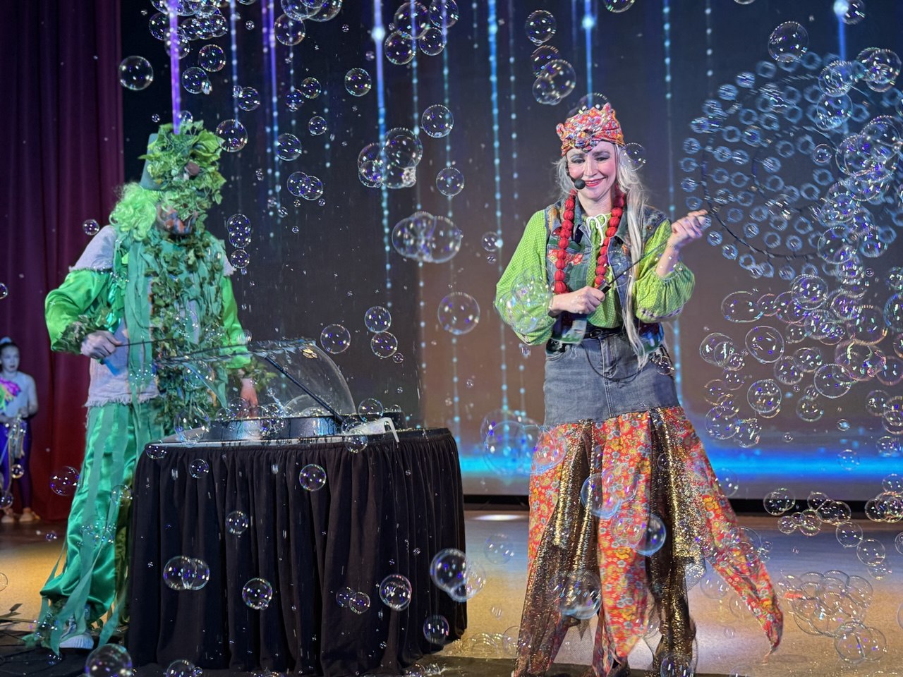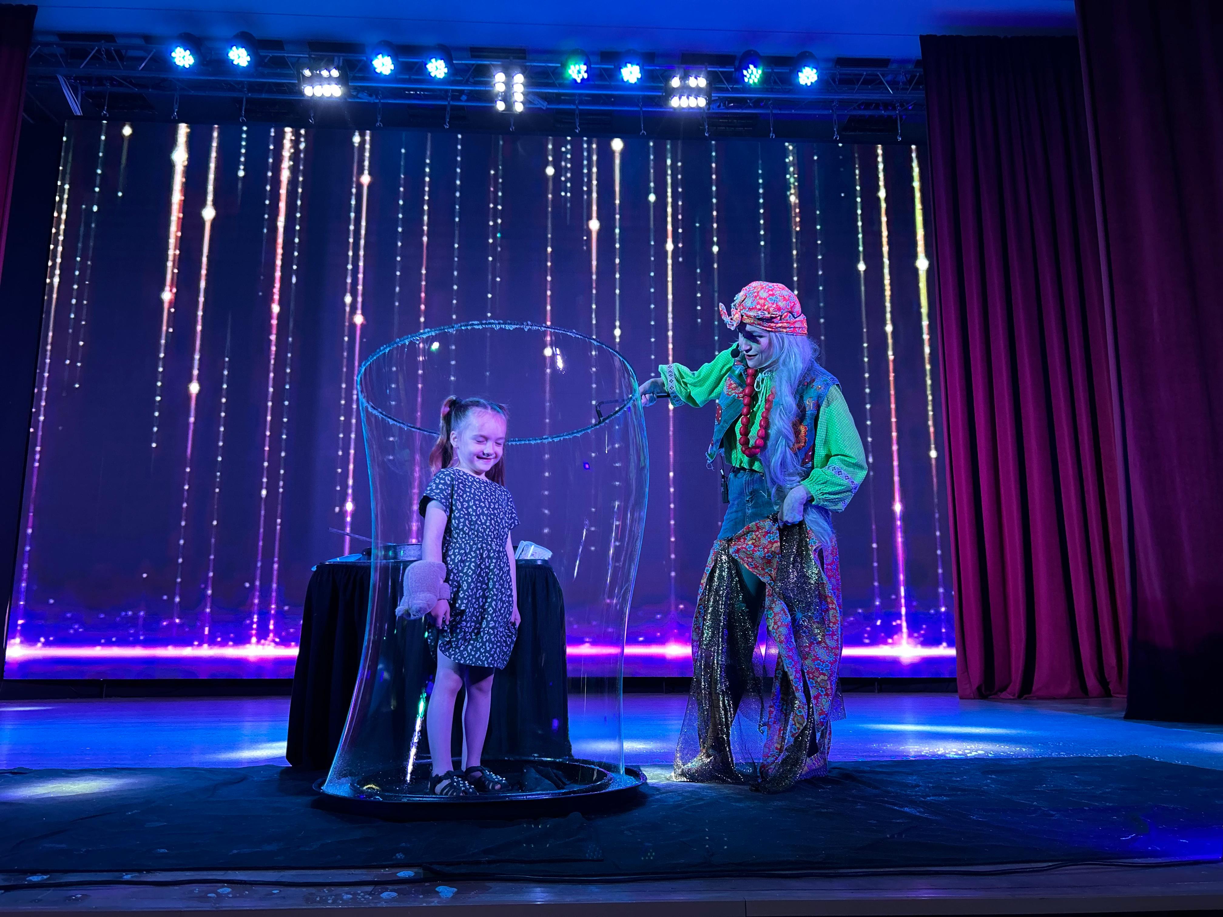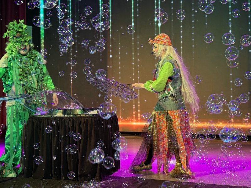 На протяжении всего путешествия для гостей выступали цирковые артисты образцовых цирковых студий «Кураж» и «Ритм». Баба Яга вместе с Лешим придумали для ребят веселые игры, танцы и шоу мыльных пузырей, которые светились и переливались в темноте.