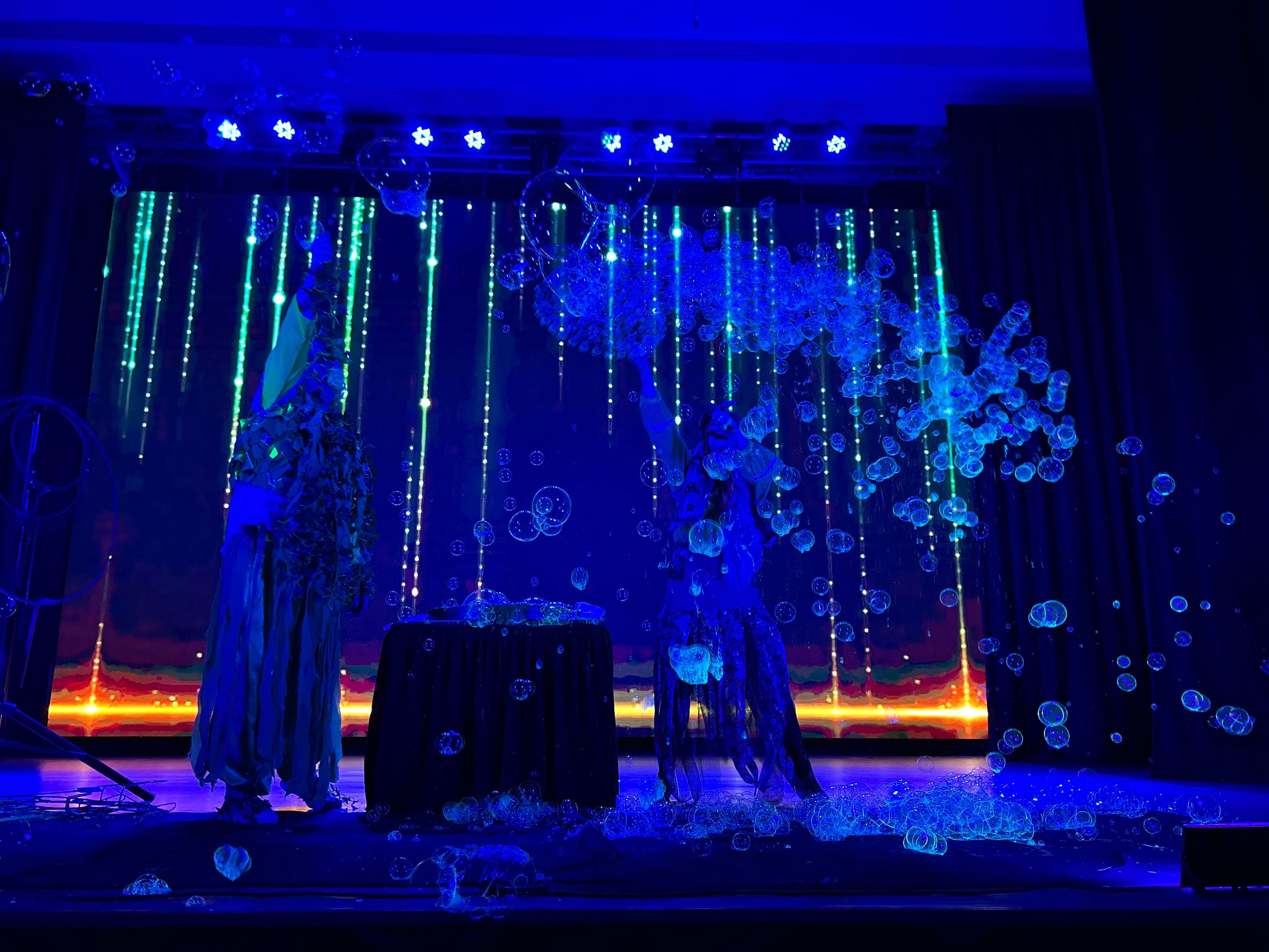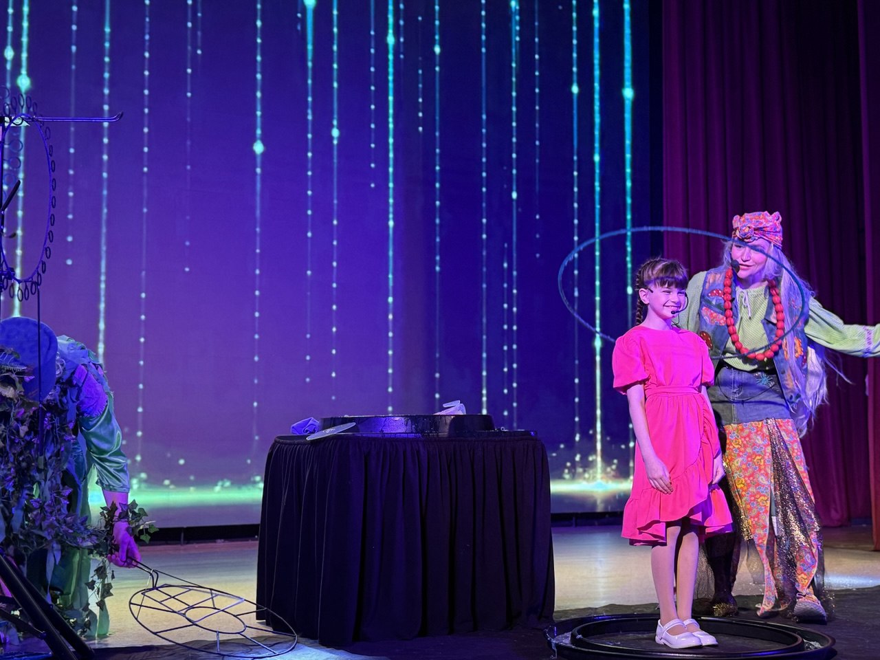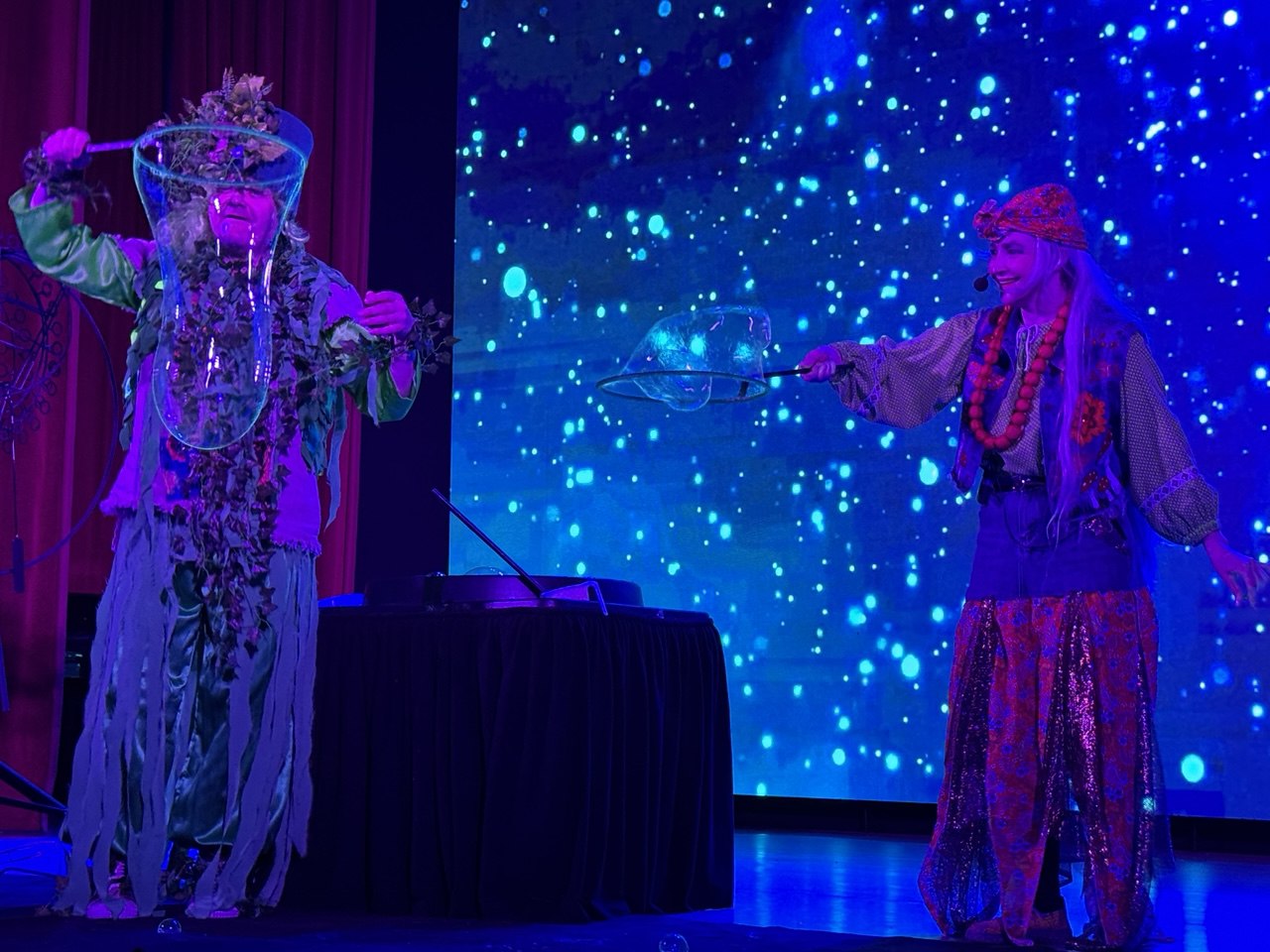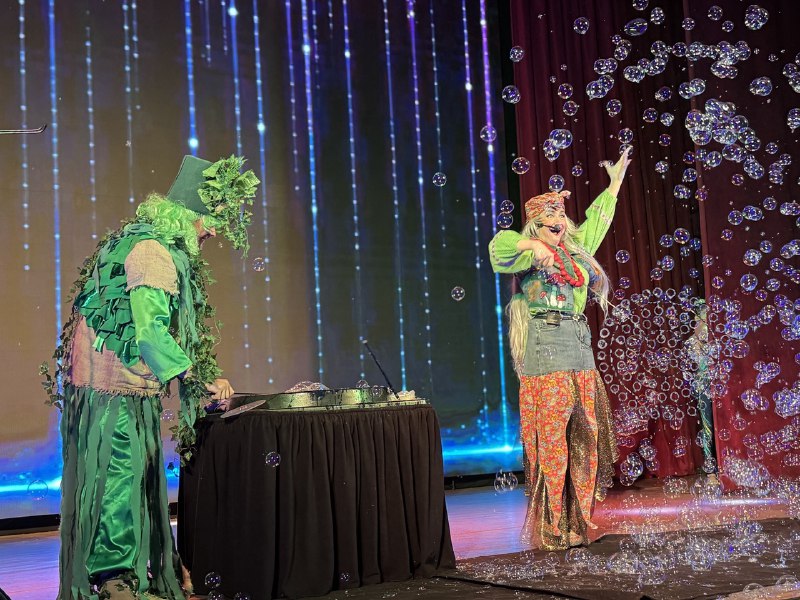 На протяжении всего путешествия для гостей выступали цирковые артисты образцовых цирковых студий «Кураж» и «Ритм». Баба Яга вместе с Лешим придумали для ребят веселые игры, танцы и шоу мыльных пузырей, которые светились и переливались в темноте.