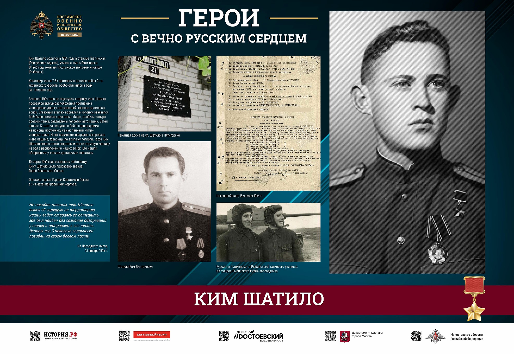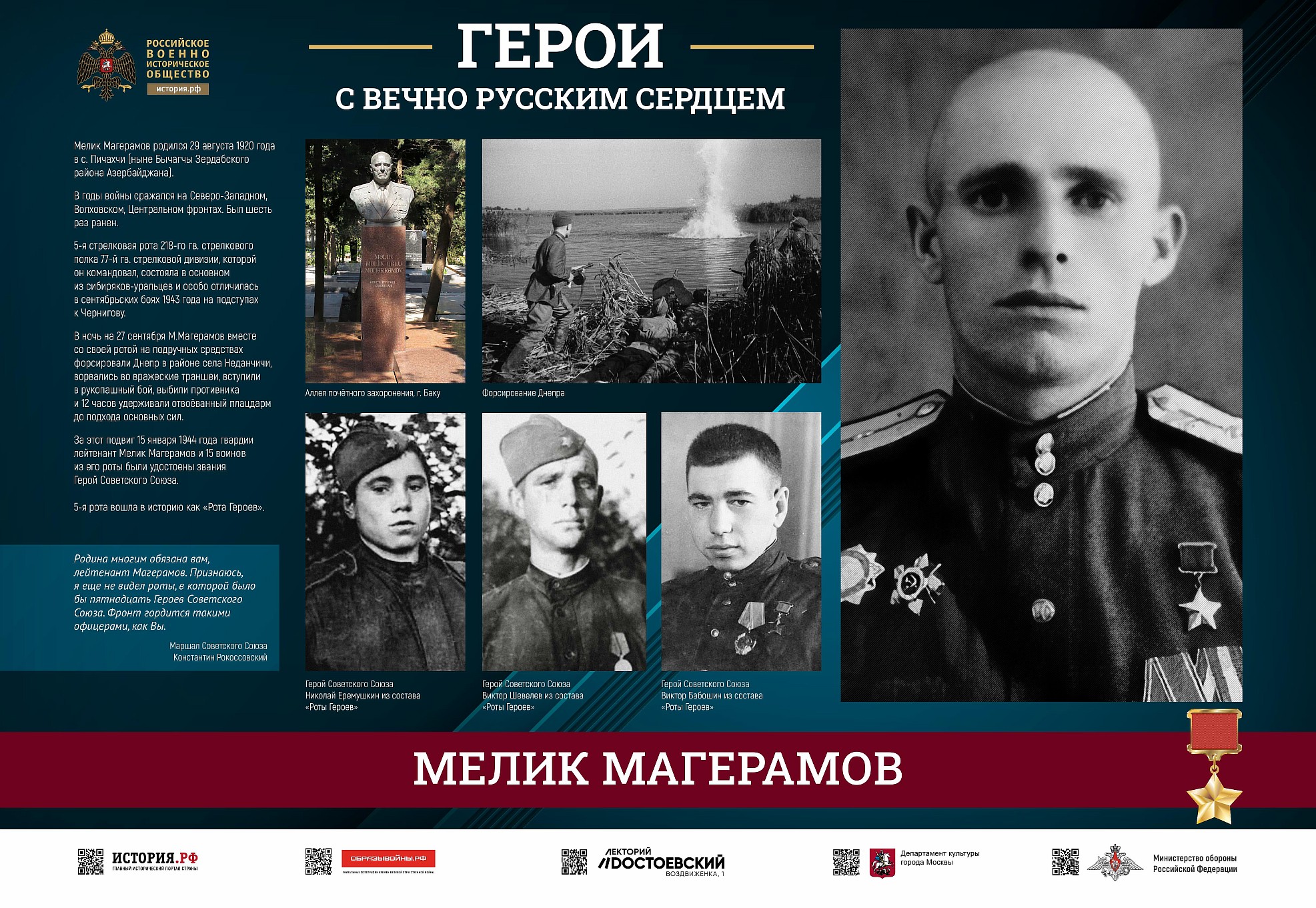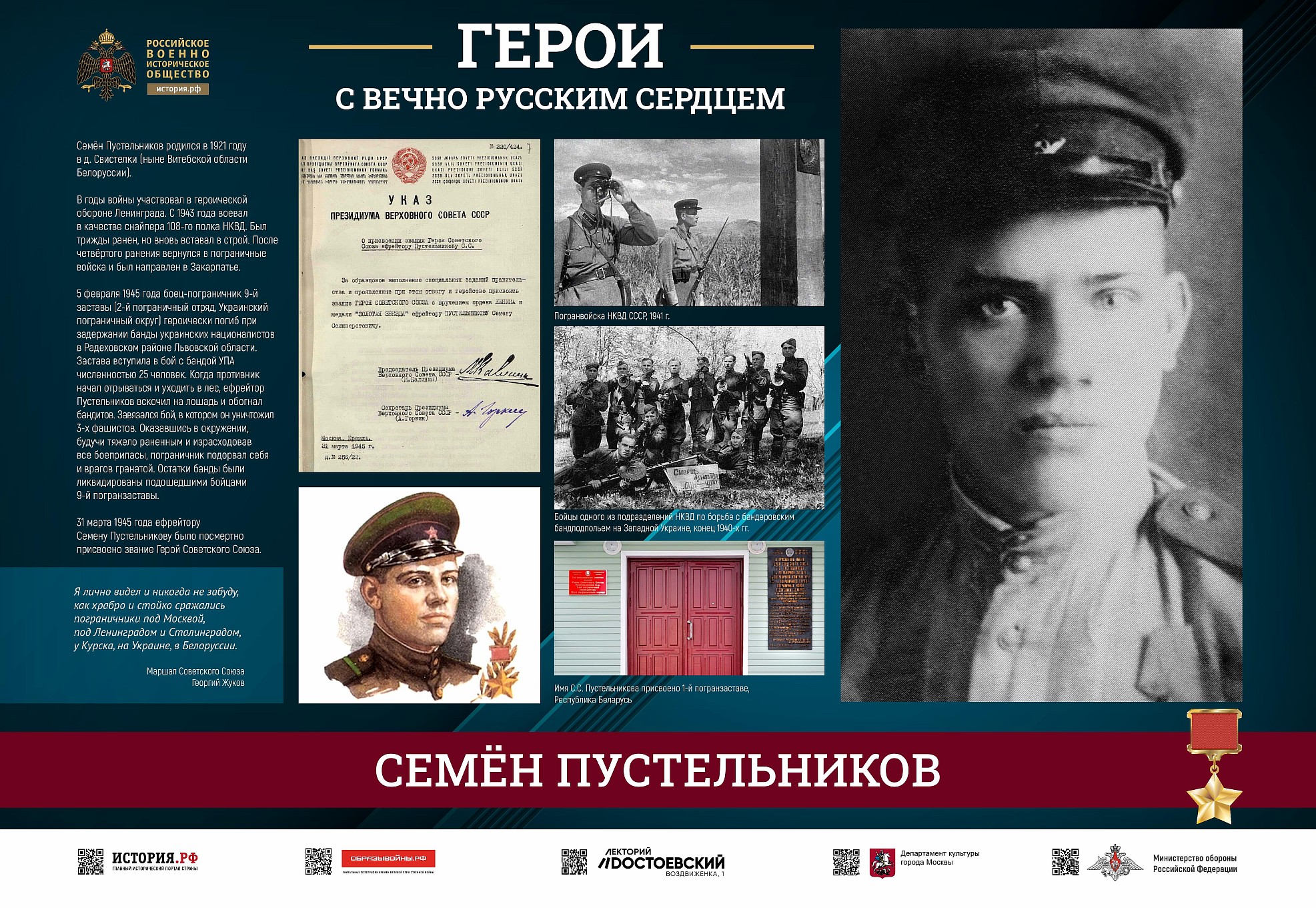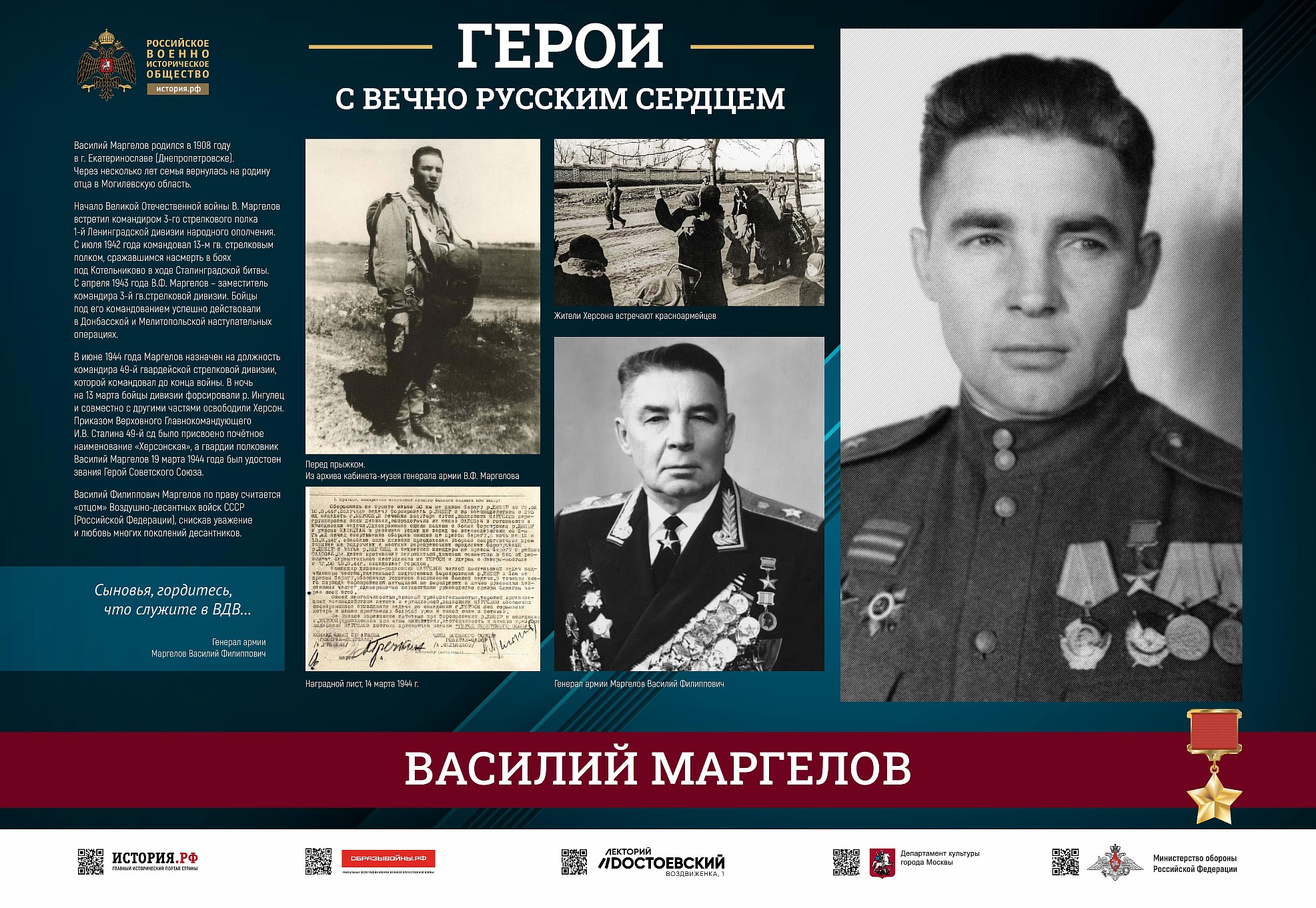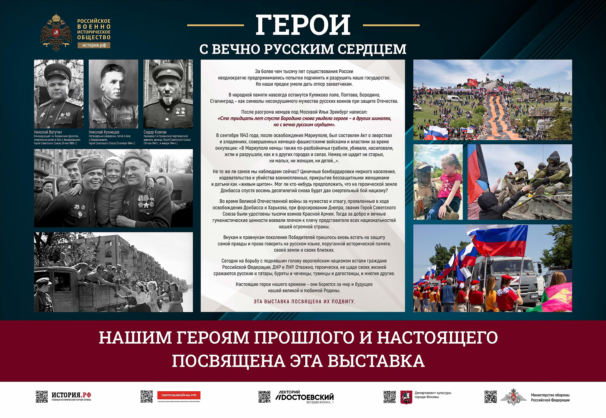 Фотовыставка «Герои с вечно русским сердцем» создана Российским военно-историческим обществом при поддержке Министерства обороны Российской Федерации.