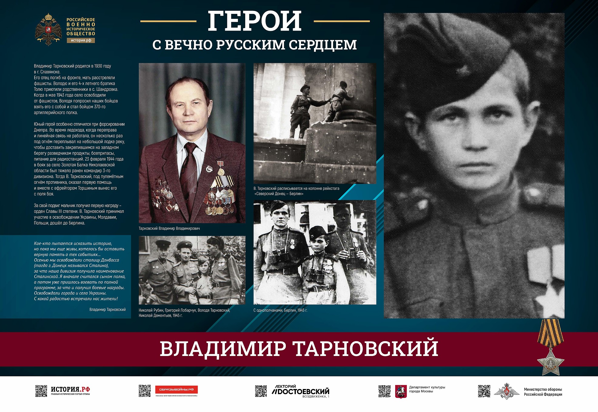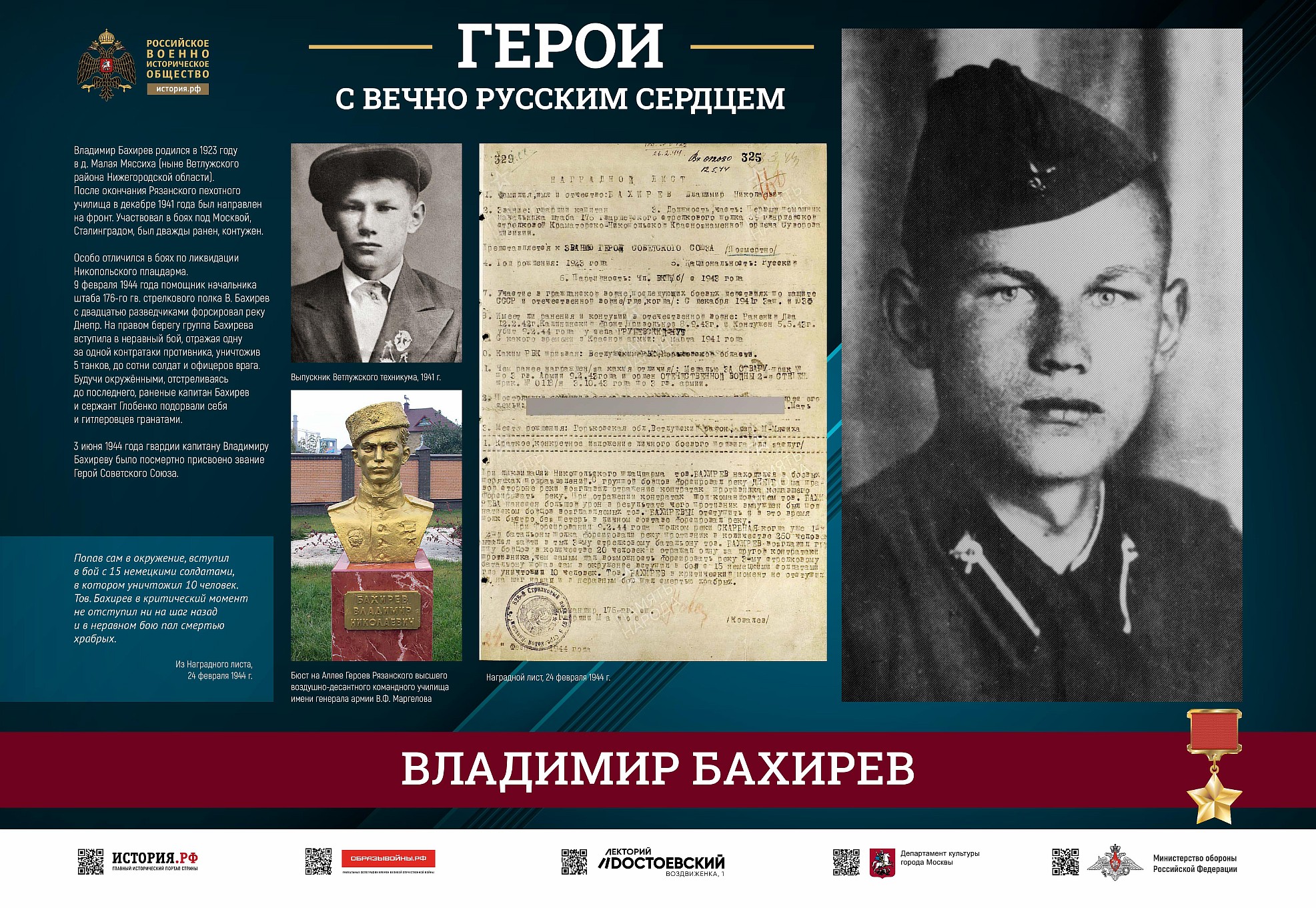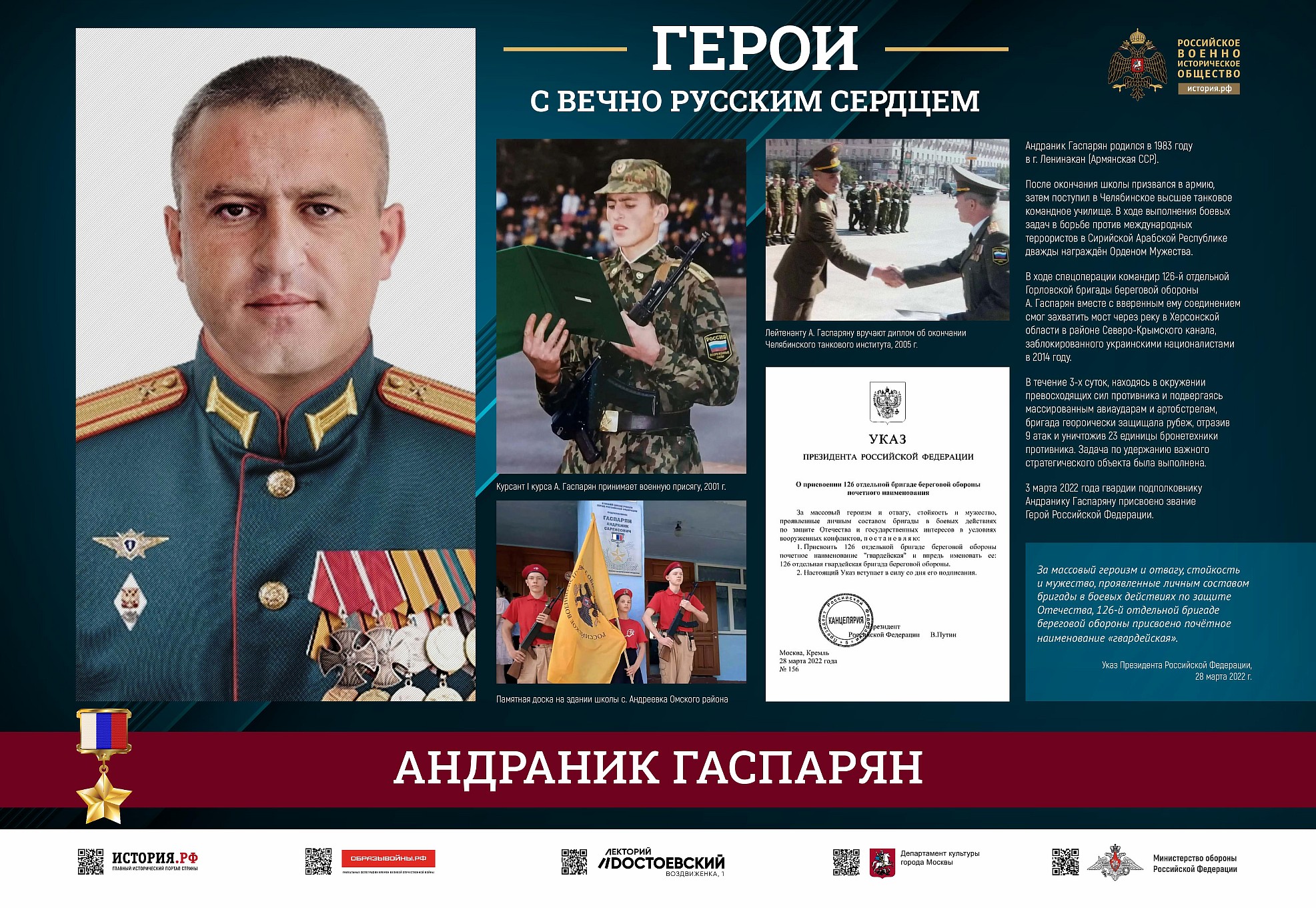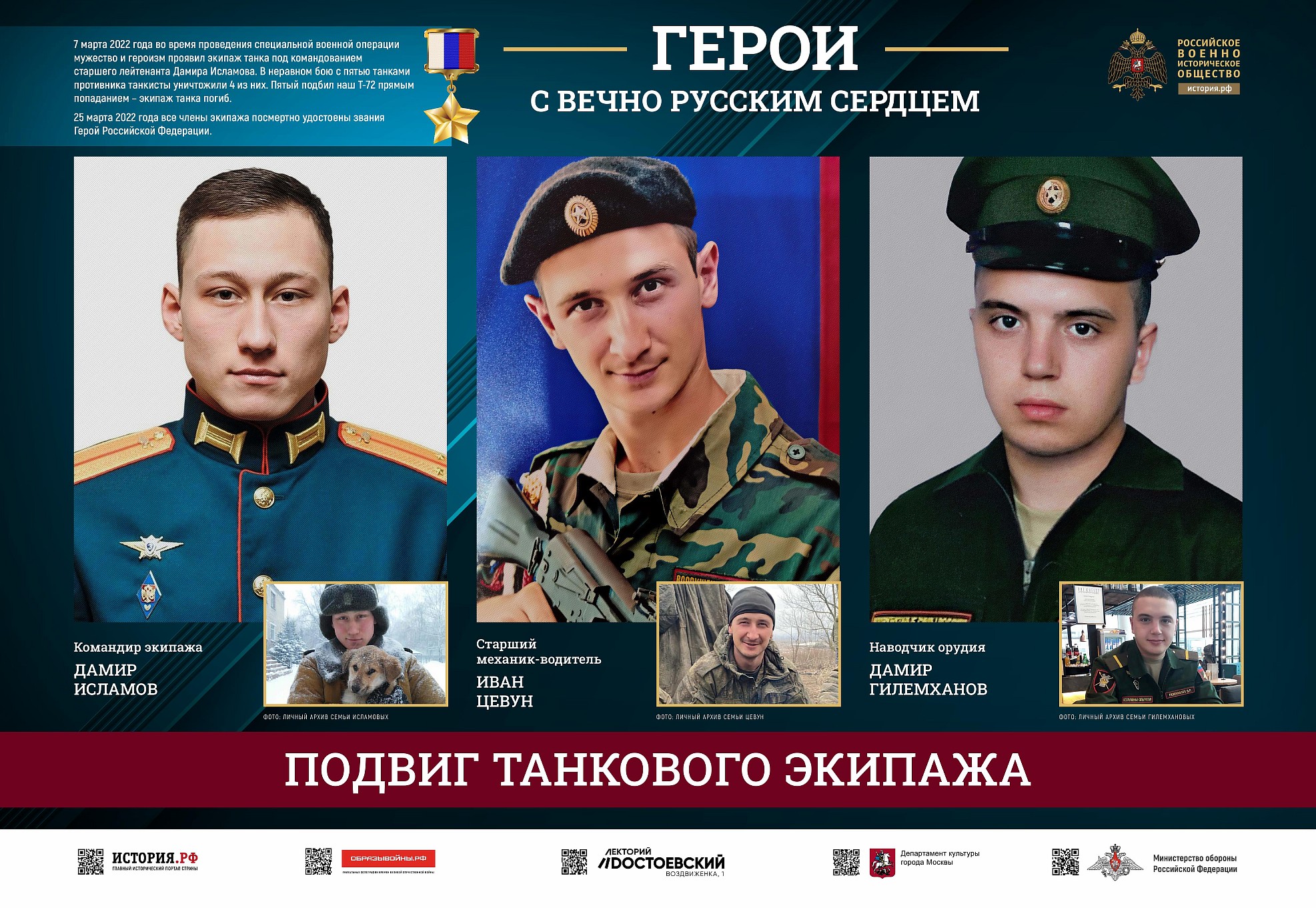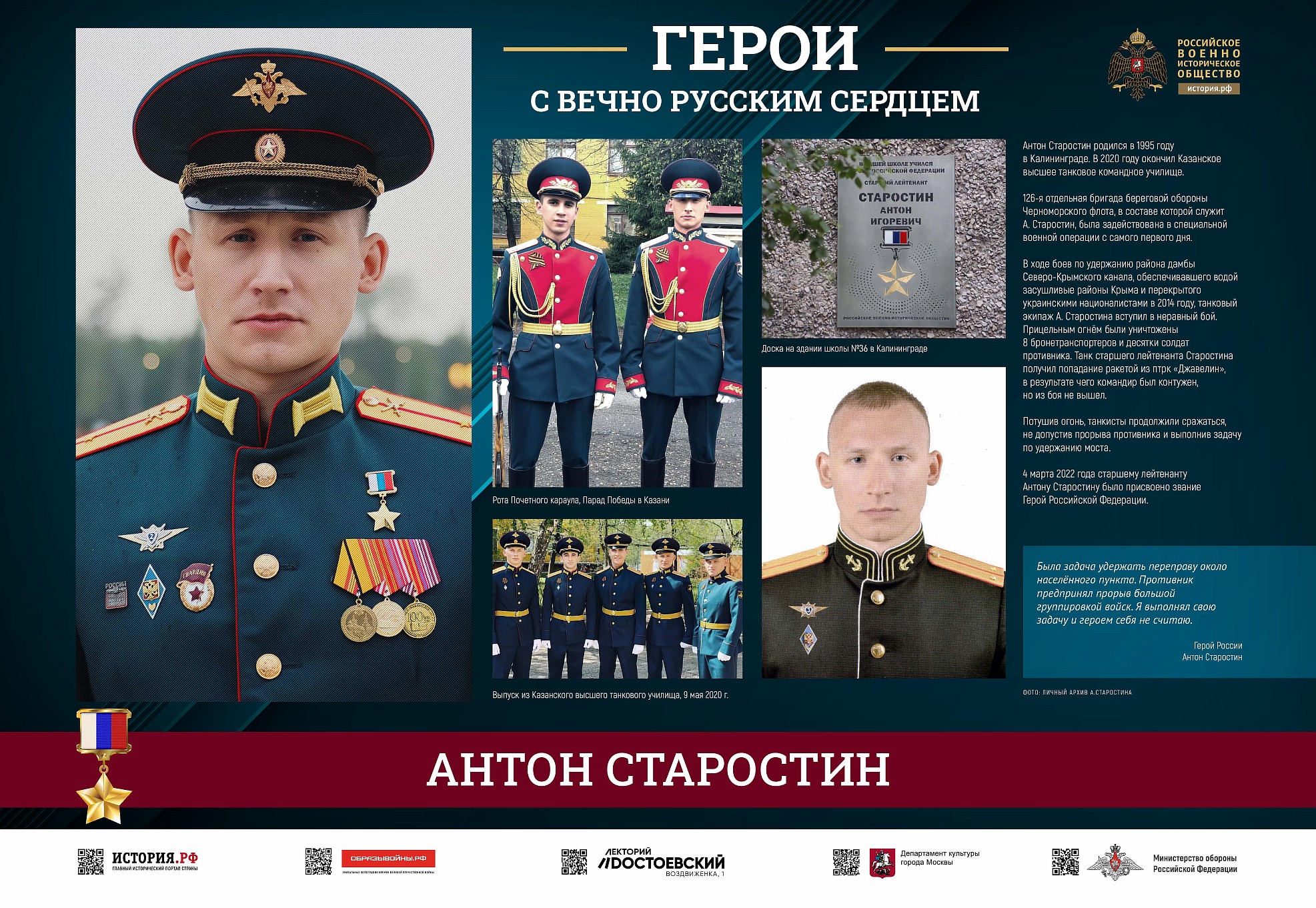 Фотовыставка «Герои с вечно русским сердцем» создана Российским военно-историческим обществом при поддержке Министерства обороны Российской Федерации.
