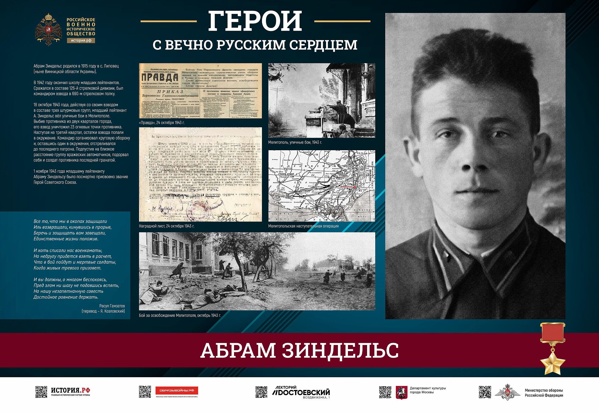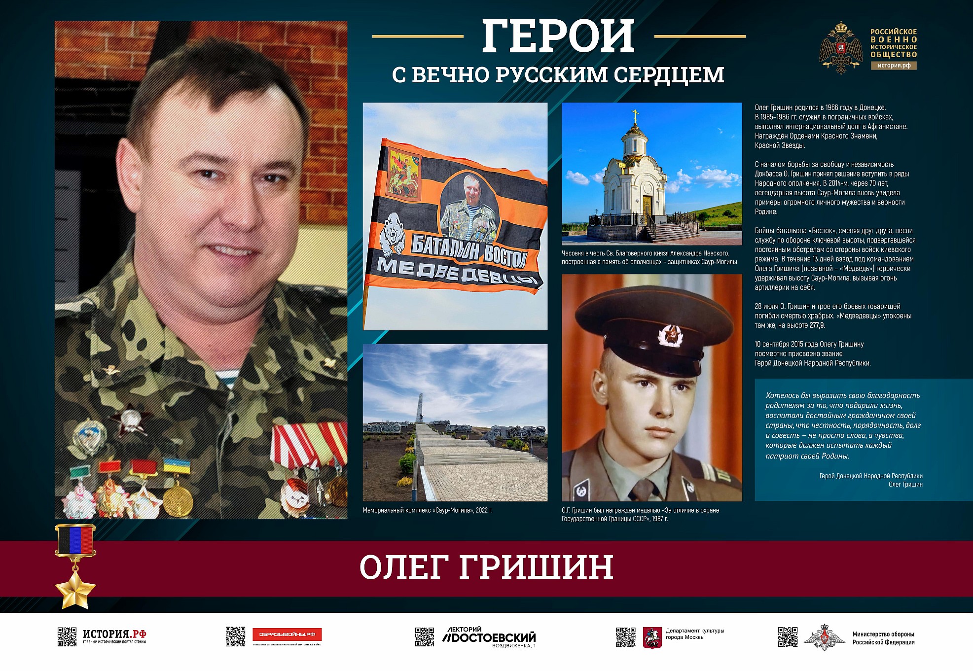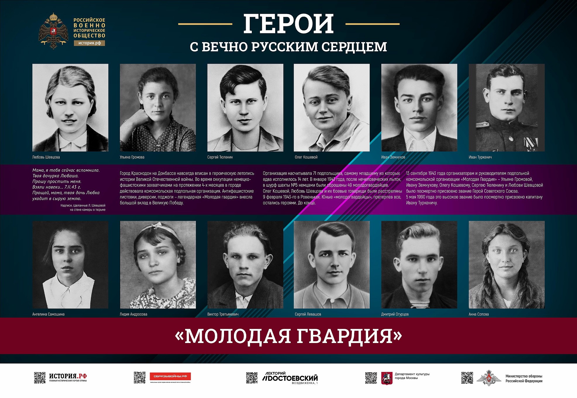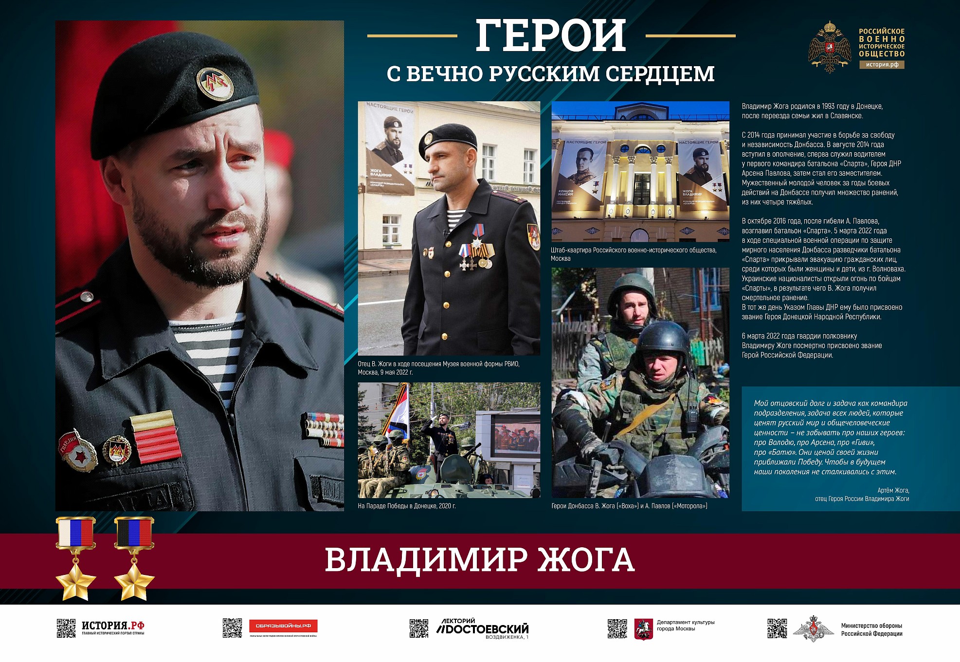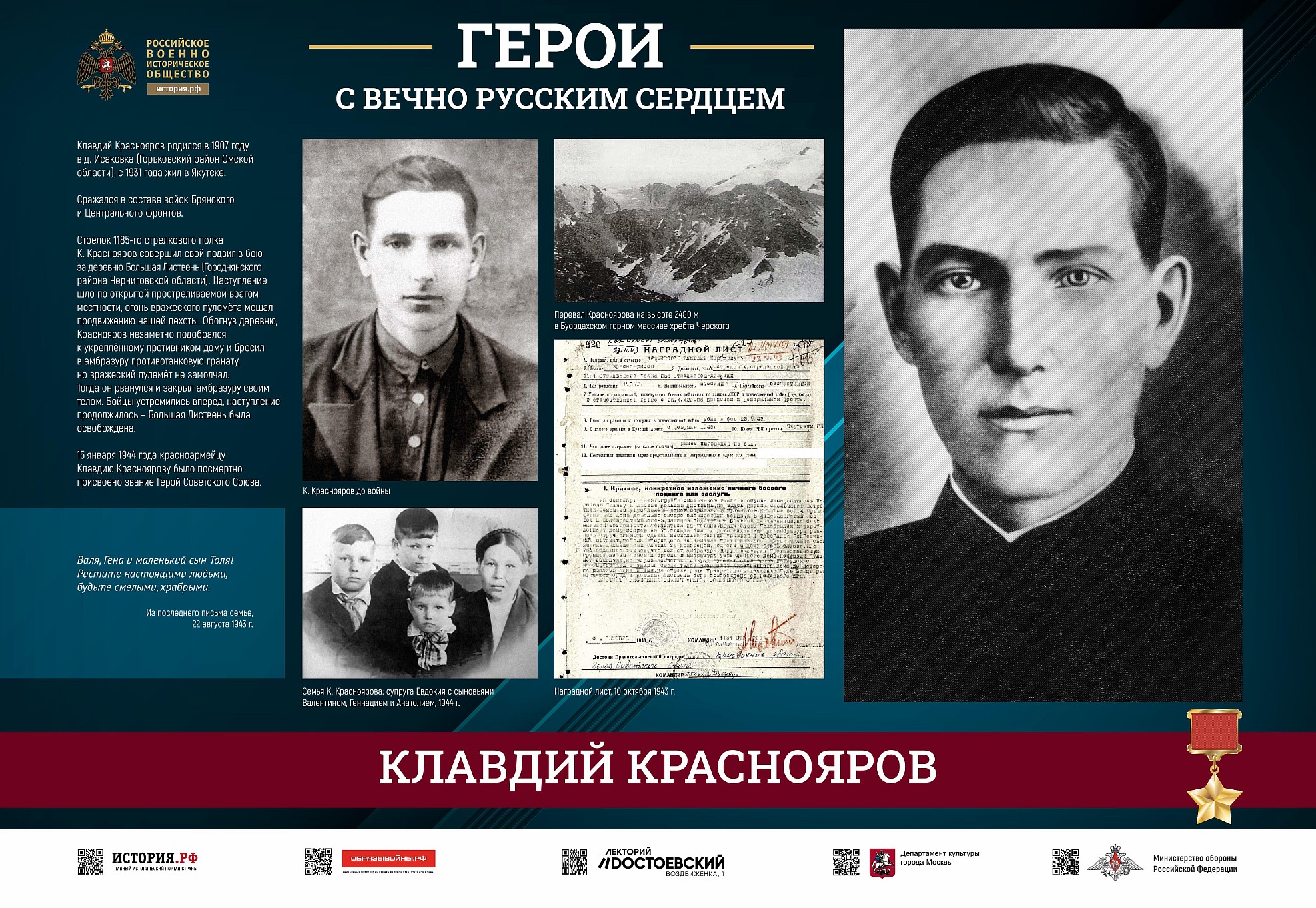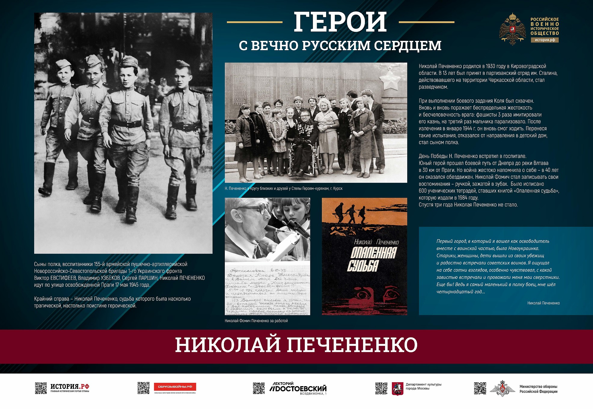 Фотовыставка «Герои с вечно русским сердцем» создана Российским военно-историческим обществом при поддержке Министерства обороны Российской Федерации.